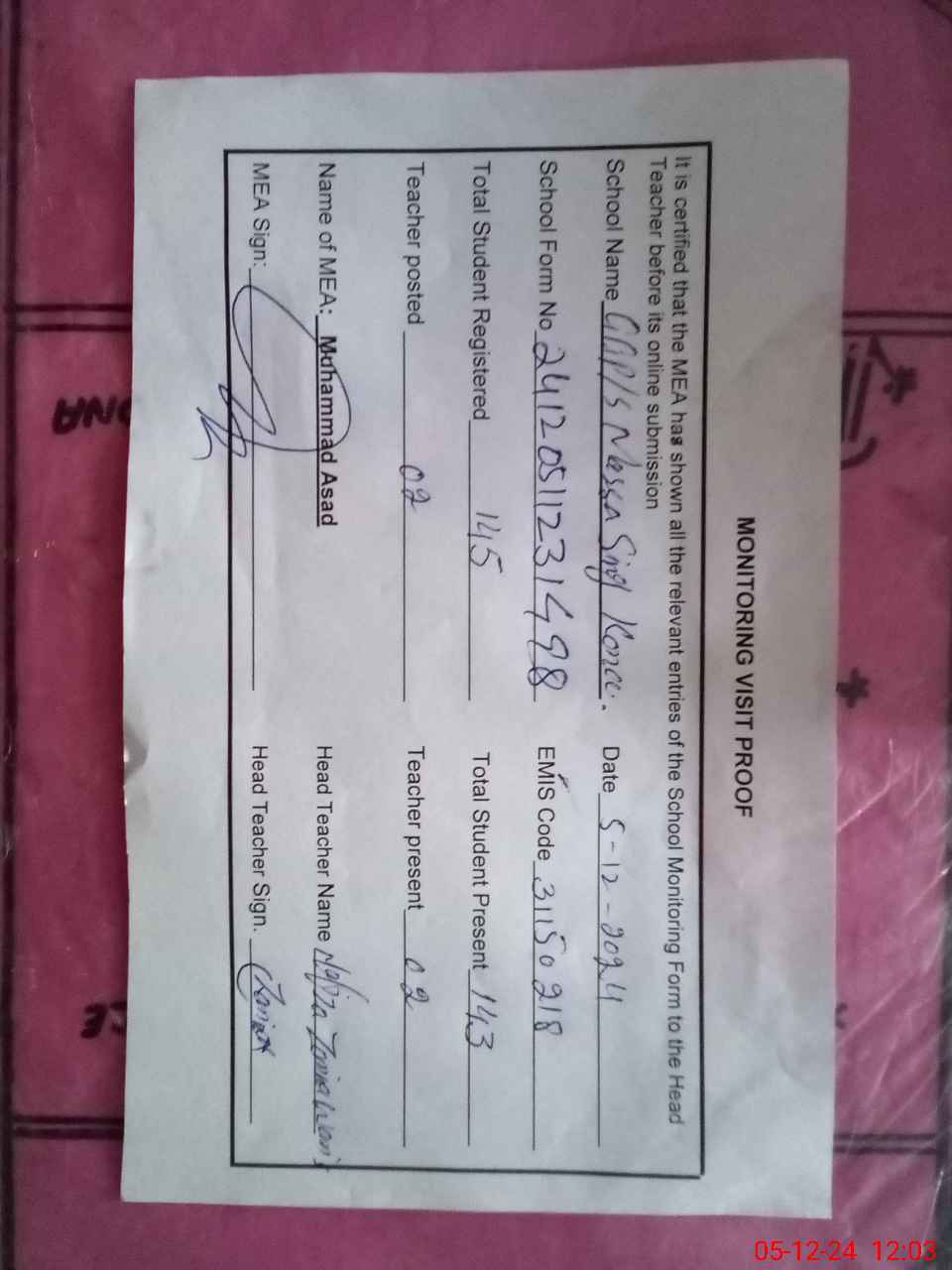 | Attendance Register | Head Teacher | MEA with School | Visit Proof |