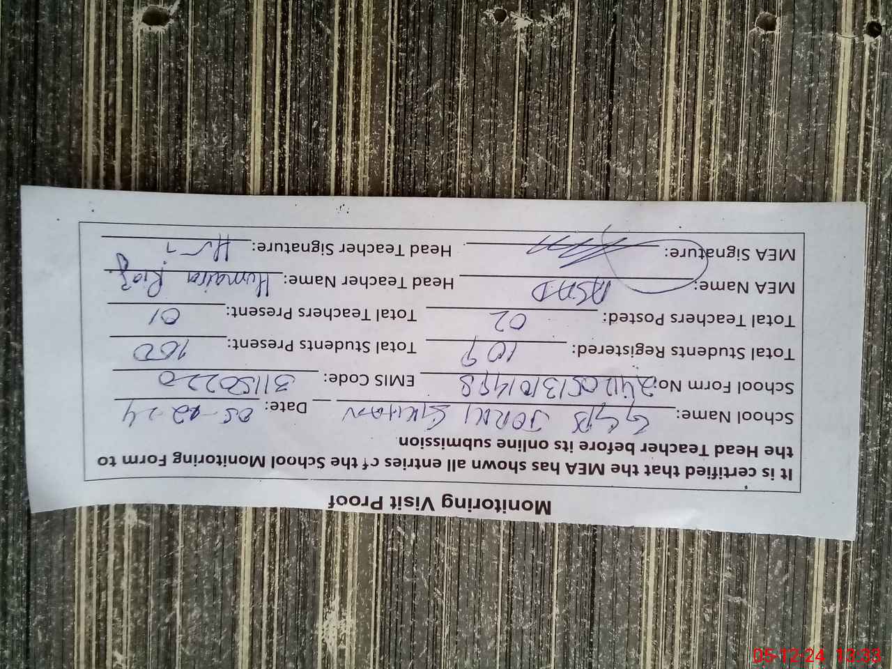 | Attendance Register | Head Teacher | MEA with School | Visit Proof |