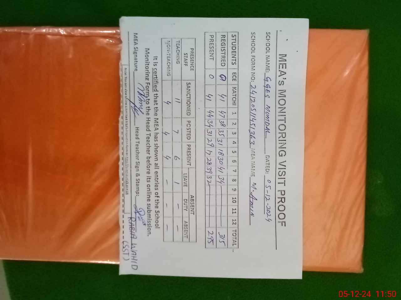 | Attendance Register | Head Teacher | MEA with School | Visit Proof |