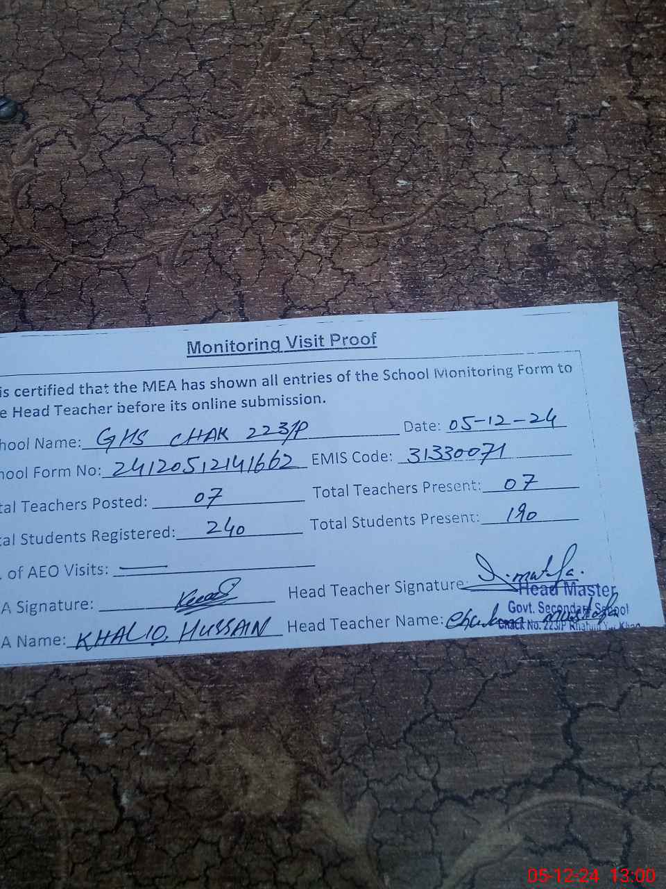 | Attendance Register | Head Teacher | MEA with School | Visit Proof |