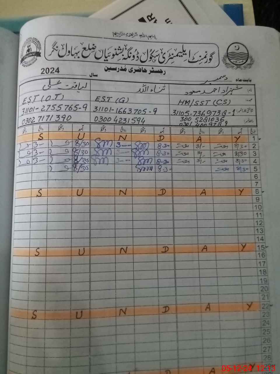 | Remarks (Use Separate Page if Required): M Zain Ul Aabdin C?V is absent from school unofficially wef 02 October 2023 One building comprising 4 classrooms is dangerous to human life and being used for teaching Needful action is to be taken to demolish or dispose off One class is being taught in Shed and one in open area One room including classes ecce katchi and class 1 have no electricity | |||||