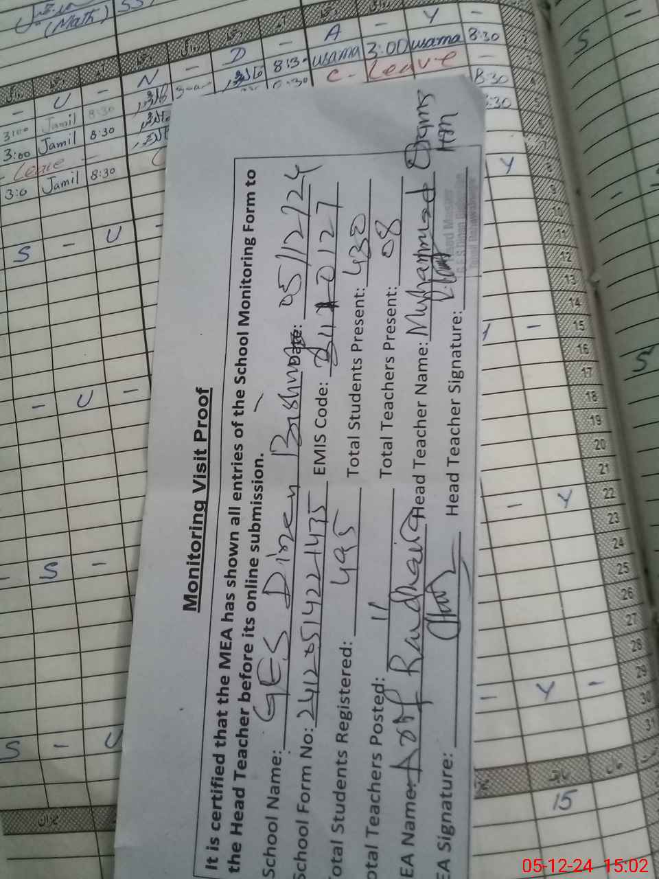 | Attendance Register | Head Teacher | MEA with School | Visit Proof |