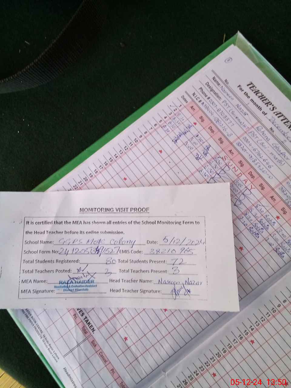 | Attendance Register | Head Teacher | MEA with School | Visit Proof |