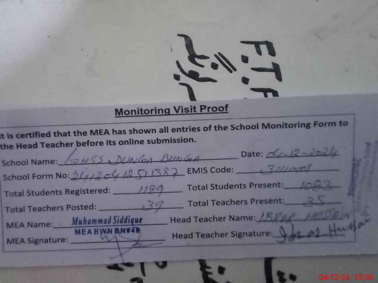 | Certified that this School was Inspected by the Undersigned MEA/DMO Today and the Information Stated Above is as Per Record. | |||||