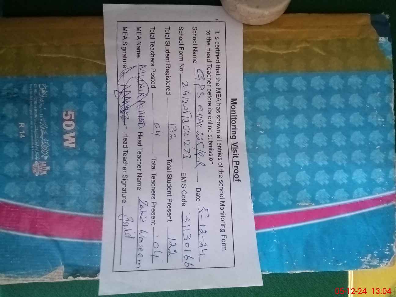 | Attendance Register | Head Teacher | MEA with School | Visit Proof |