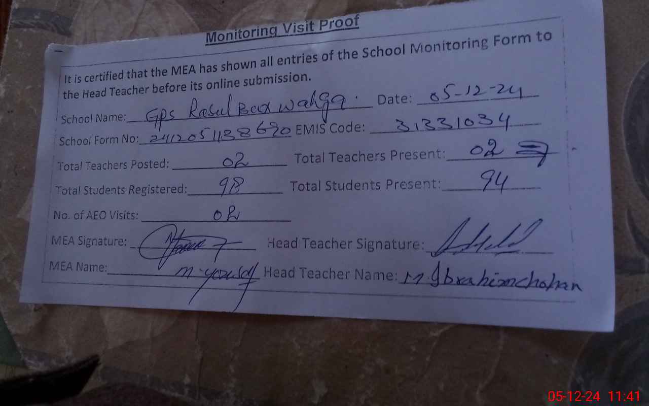 | EMIS Code: 31331034 | Name of School: GPS RASUL BUX WAHGA | |||