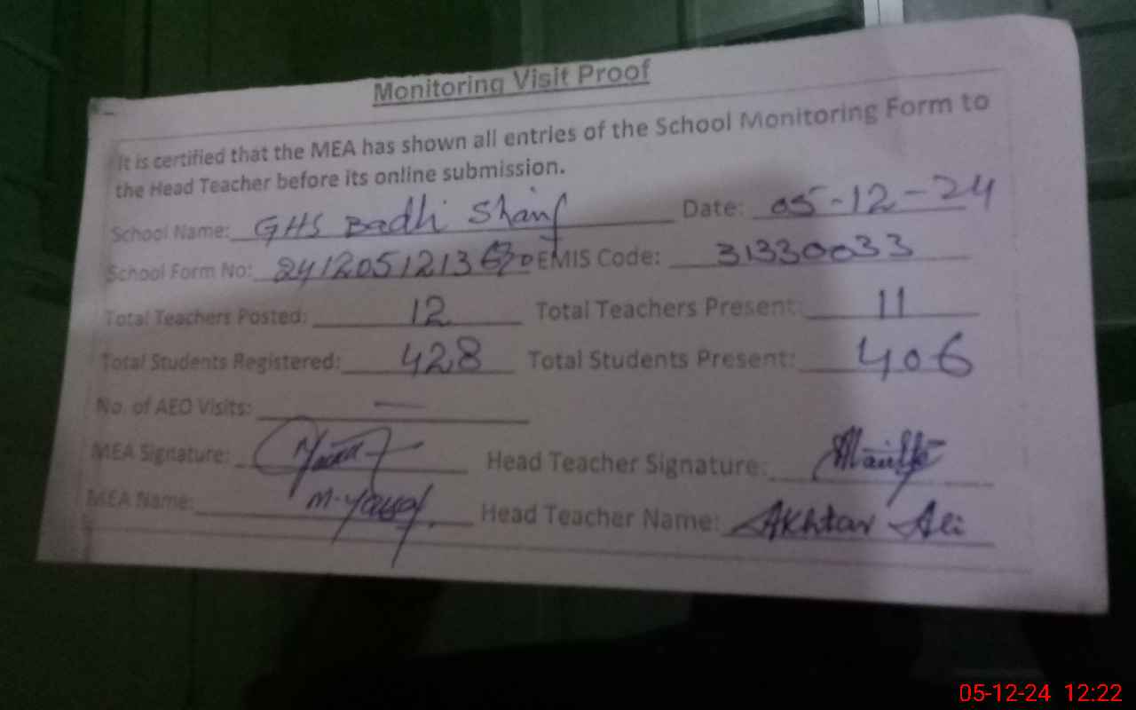 | EMIS Code: 31330033 | Name of School: GHS BADLI SHARIF | |||