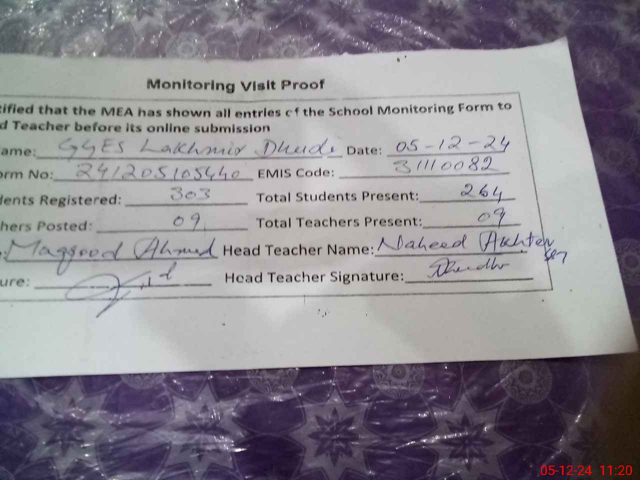 | Attendance Register | Head Teacher | MEA with School | Visit Proof |