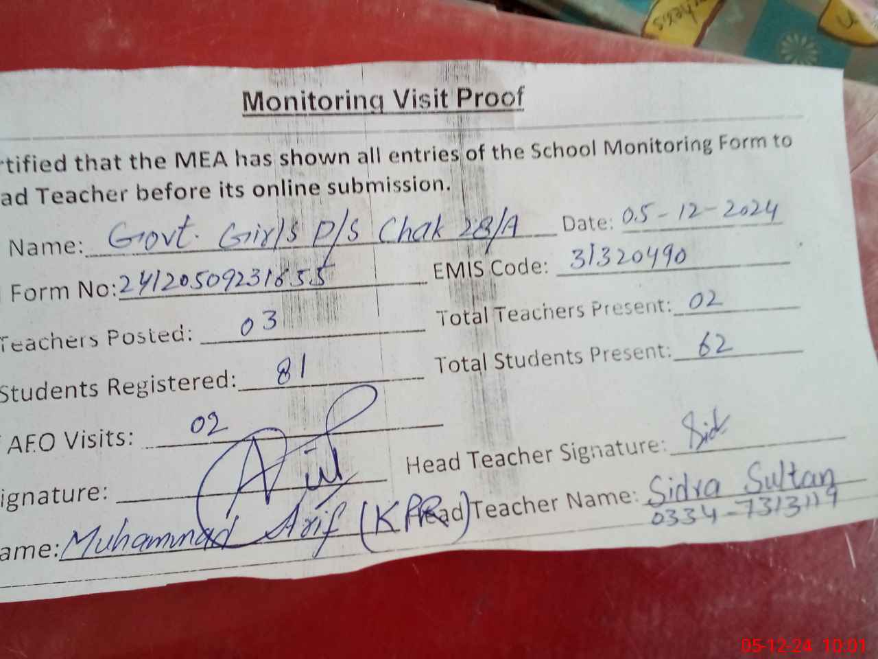 | EMIS Code: 31320490 | Name of School: GGPS CHAK NO.28/A | |||