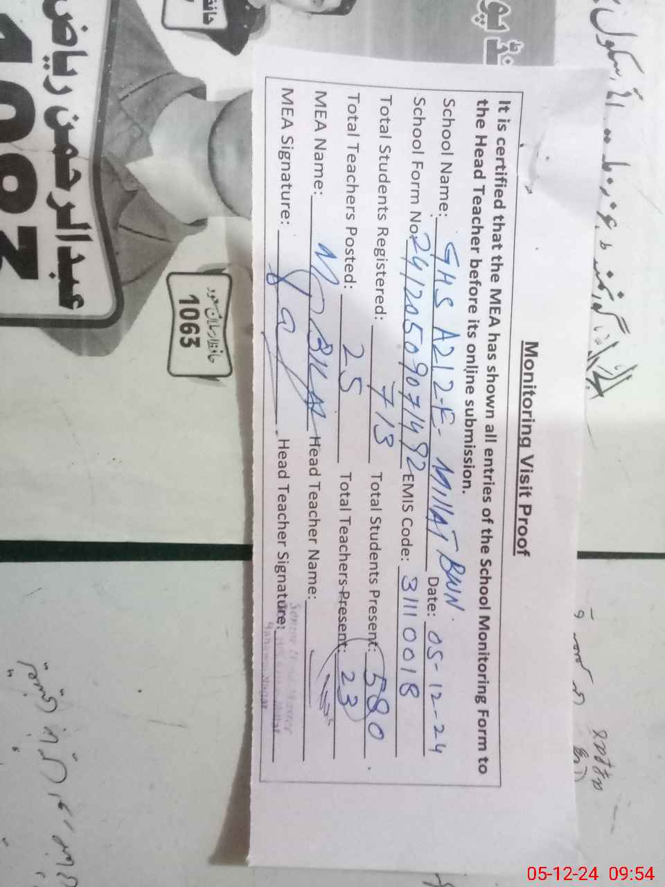 | Attendance Register | Head Teacher | MEA with School | Visit Proof |