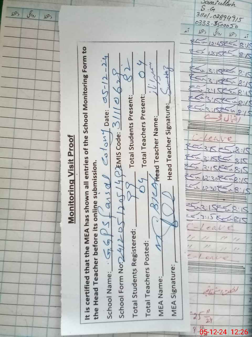 | Attendance Register | Head Teacher | MEA with School | Visit Proof |
