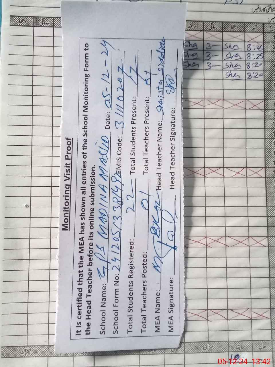 | Attendance Register | Head Teacher | MEA with School | Visit Proof |