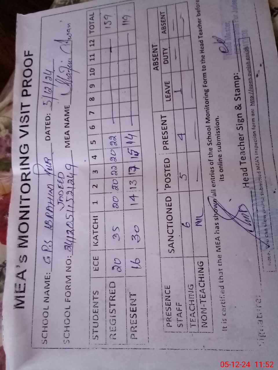 | Attendance Register | Head Teacher | MEA with School | Visit Proof |