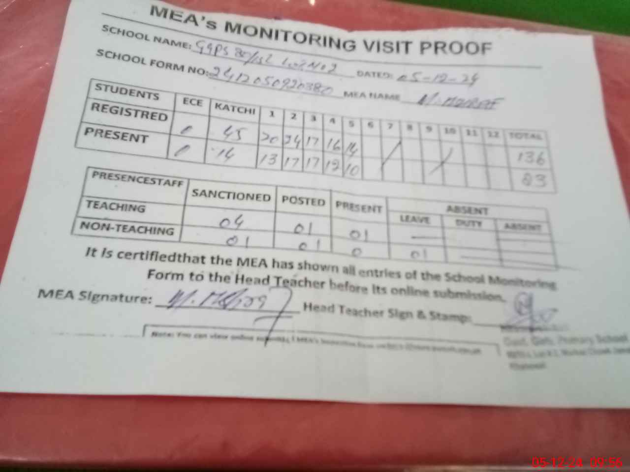 | Attendance Register | Head Teacher | MEA with School | Visit Proof |