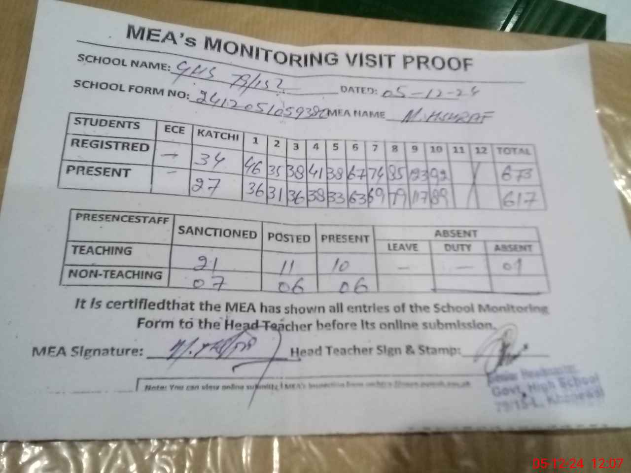 | Certified that this School was Inspected by the Undersigned MEA/DMO Today and the Information Stated Above is as Per Record. | |||||