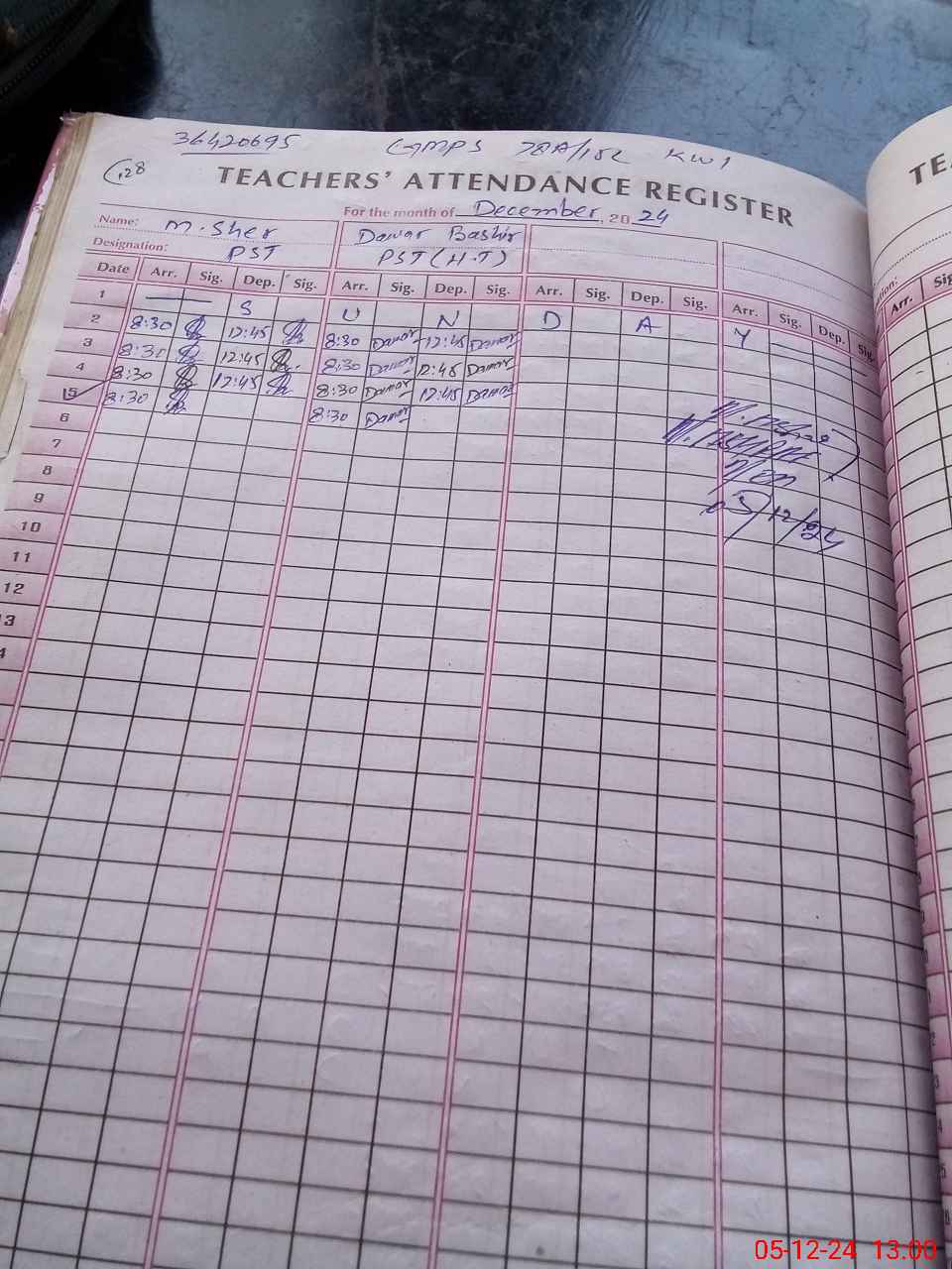 | Remarks (Use Separate Page if Required): Note NO AEO VISIT IN MONTH OF NOVEMBER 2024 Students enrollments different according to students attendance register and roznamcha Different 14 students During school time at 1230hrs some classes were busy in rooms and lawn cleaniness | |||||