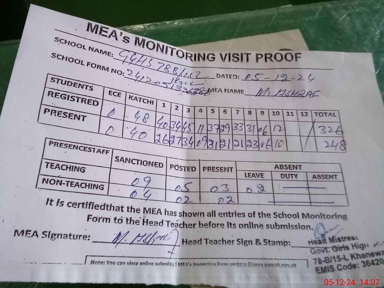 | EMIS Code: 36420656 | Name of School: GGHS 78-B/15-L, KACHA KHUH | |||