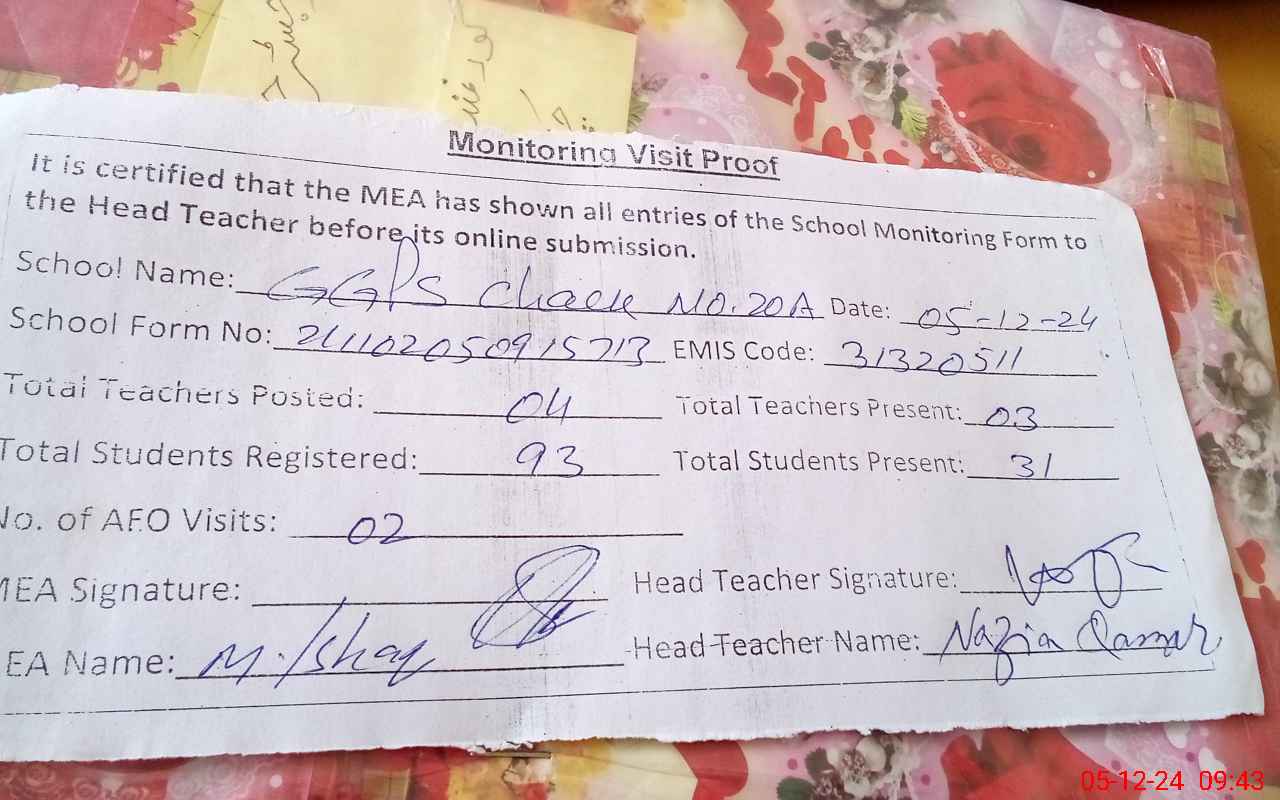 | EMIS Code: 31320511 | Name of School: GGPS CHAK NO.20/A | |||