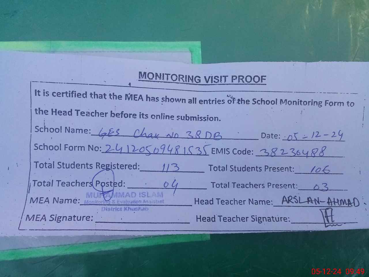 | EMIS Code: 38230488 | Name of School: GES CHAK NO. 38 DB | |||