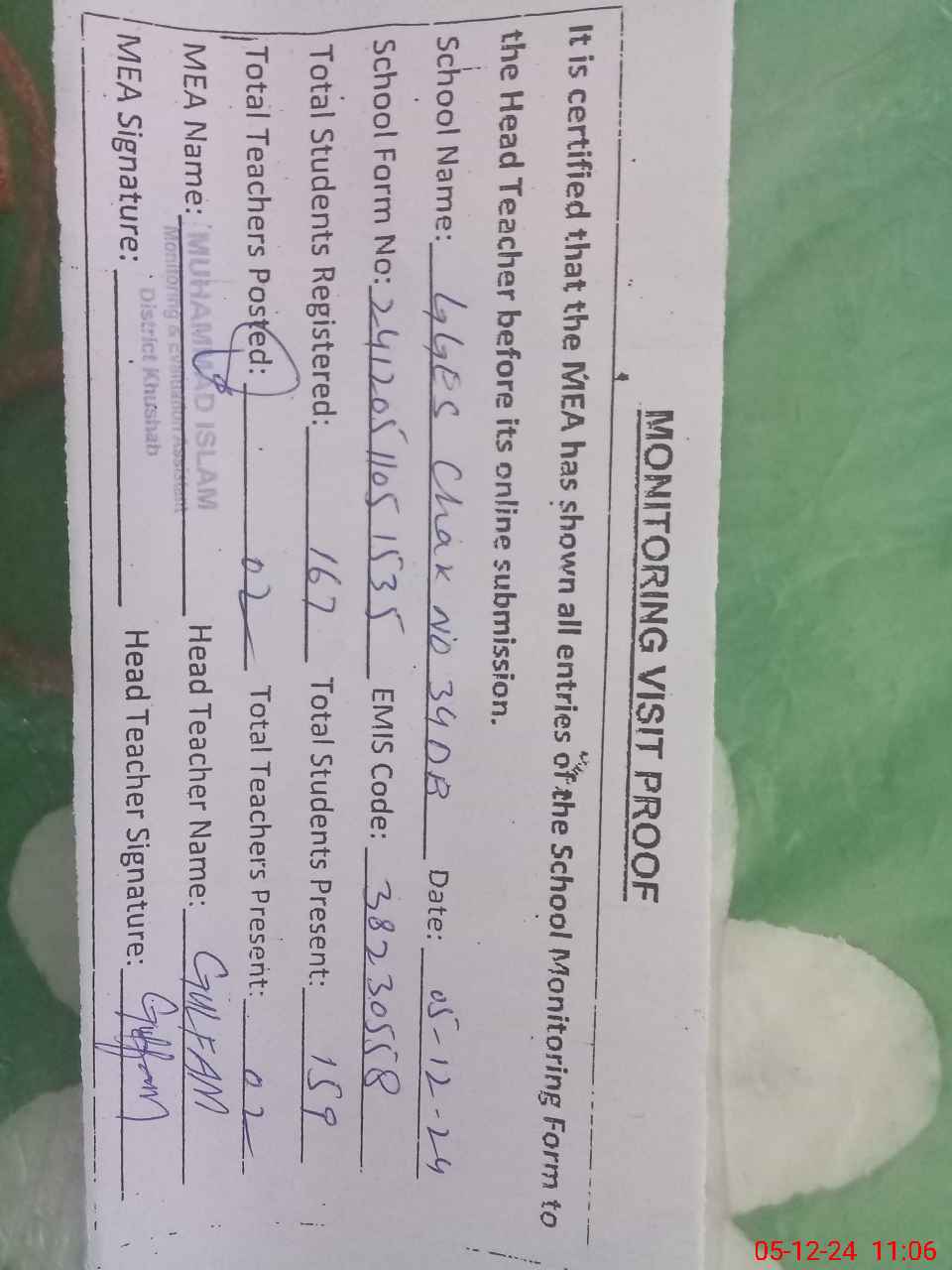 | Attendance Register | Head Teacher | MEA with School | Visit Proof |