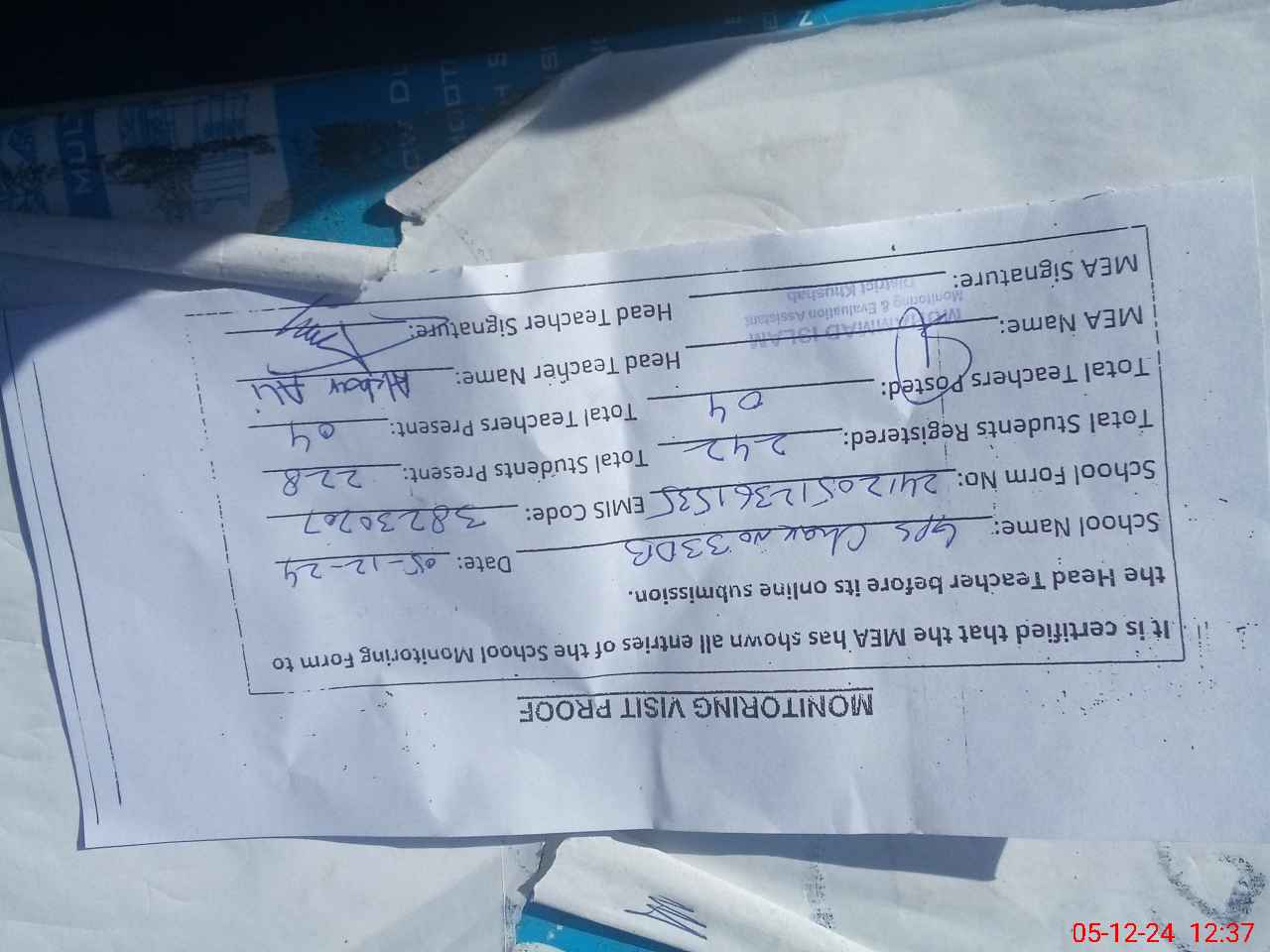 | Attendance Register | Head Teacher | MEA with School | Visit Proof |