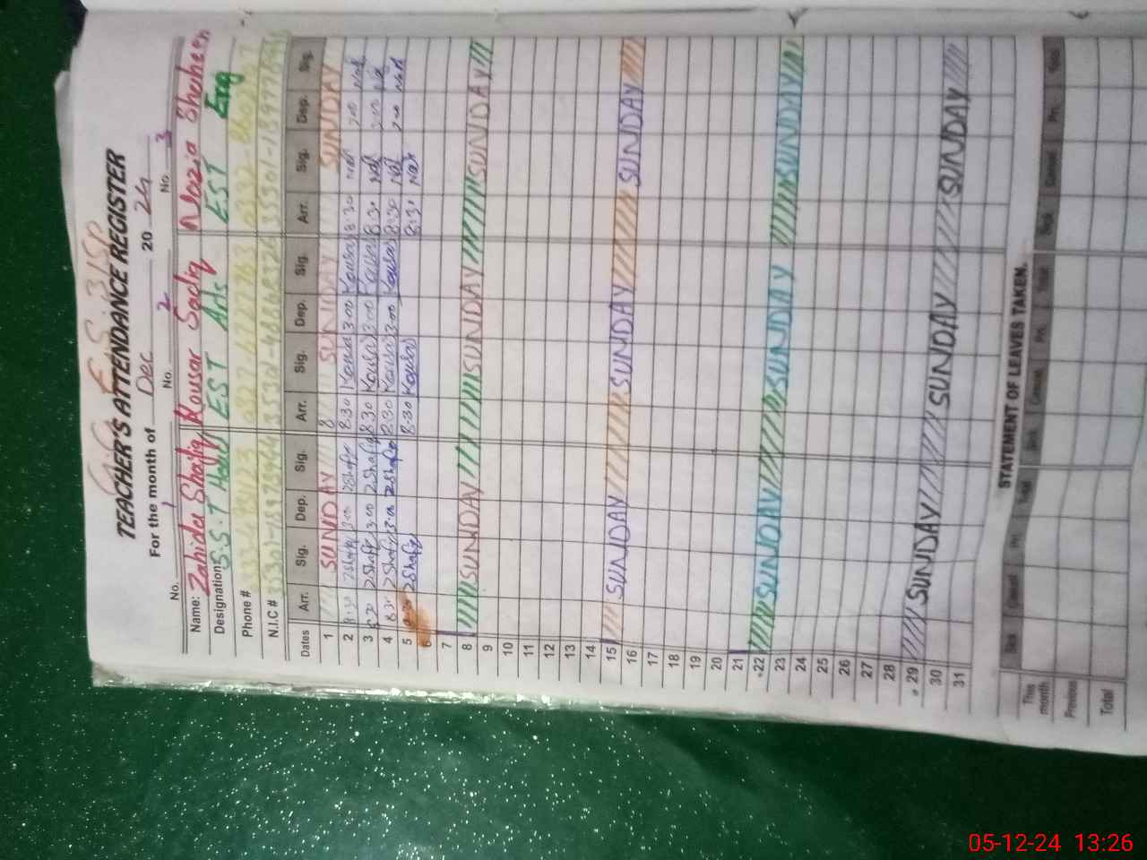 | CNIC | Full Name | Designation | R/C | Absence During Last Calender Month |