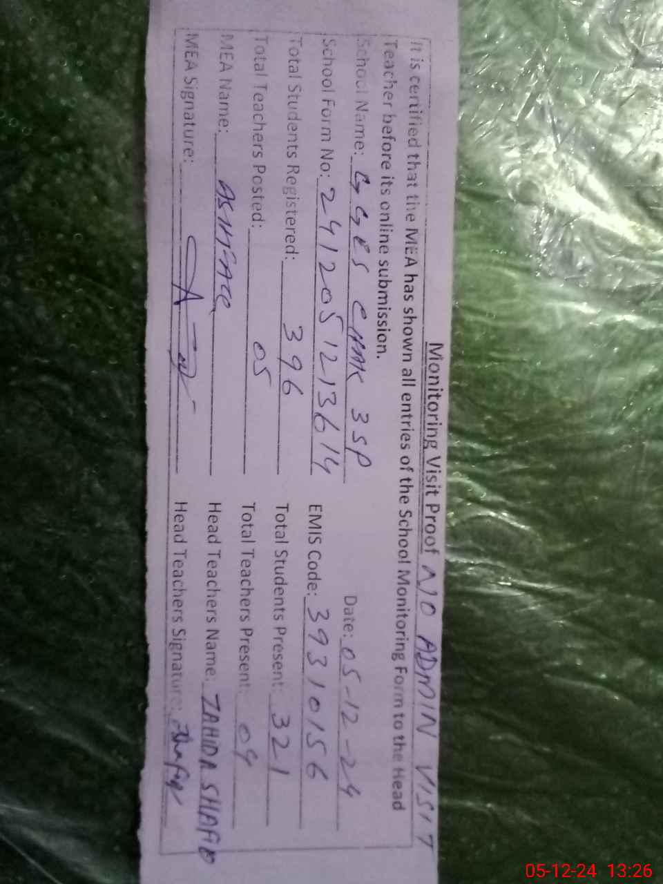 | Attendance Register | Head Teacher | MEA with School | Visit Proof |