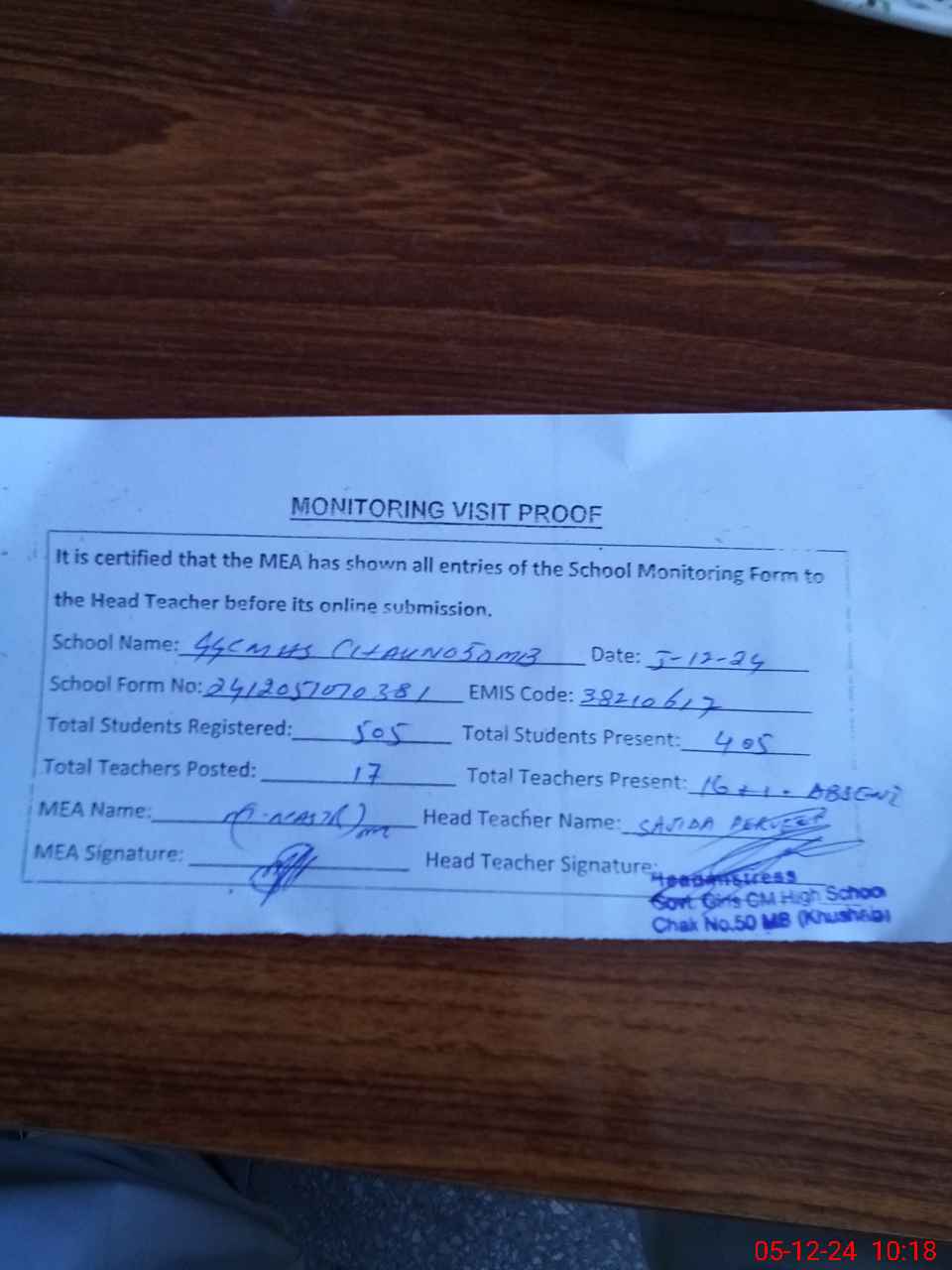 | EMIS Code: 38210617 | Name of School: GGCMHS CHAK 50 MB | |||
