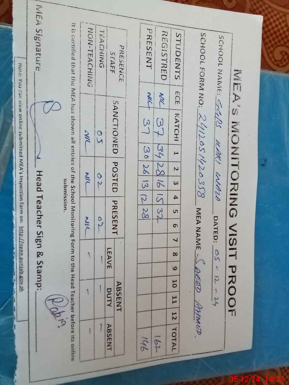 | Attendance Register | Head Teacher | MEA with School | Visit Proof |