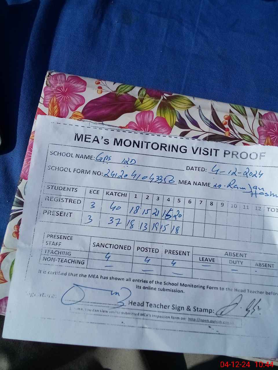 | Attendance Register | Head Teacher | MEA with School | Visit Proof |