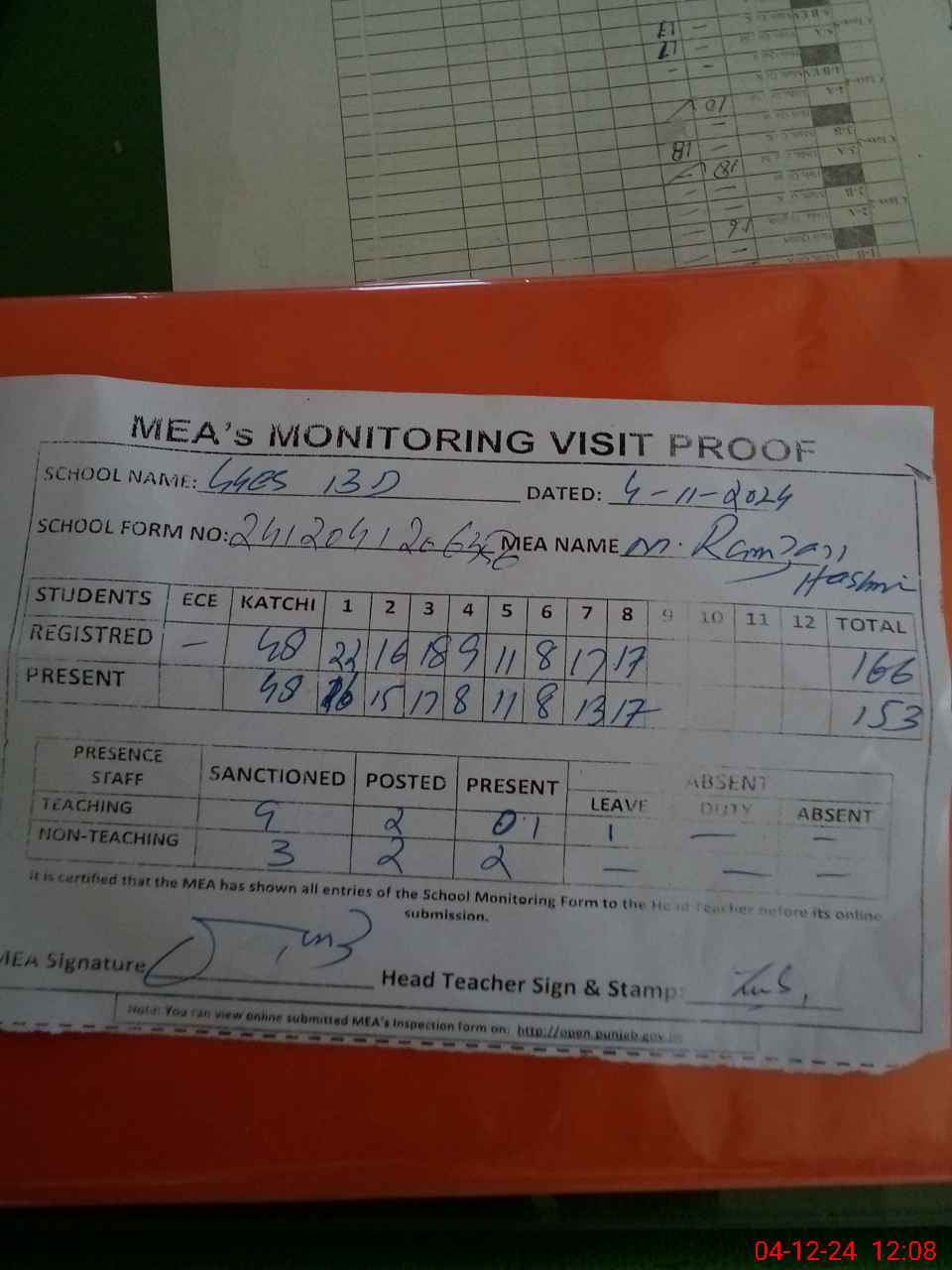 | Attendance Register | Head Teacher | MEA with School | Visit Proof |