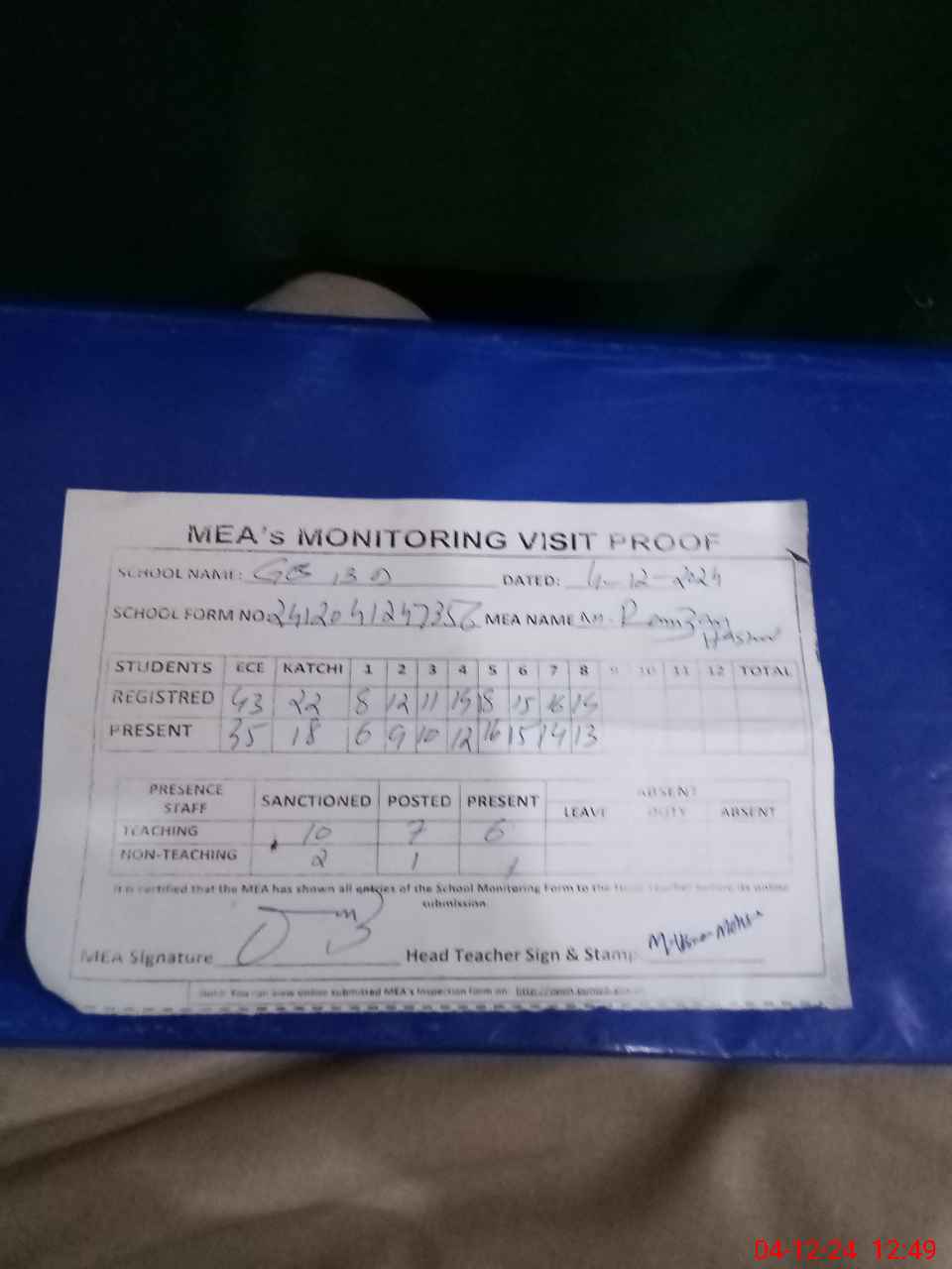 | Attendance Register | Head Teacher | MEA with School | Visit Proof |