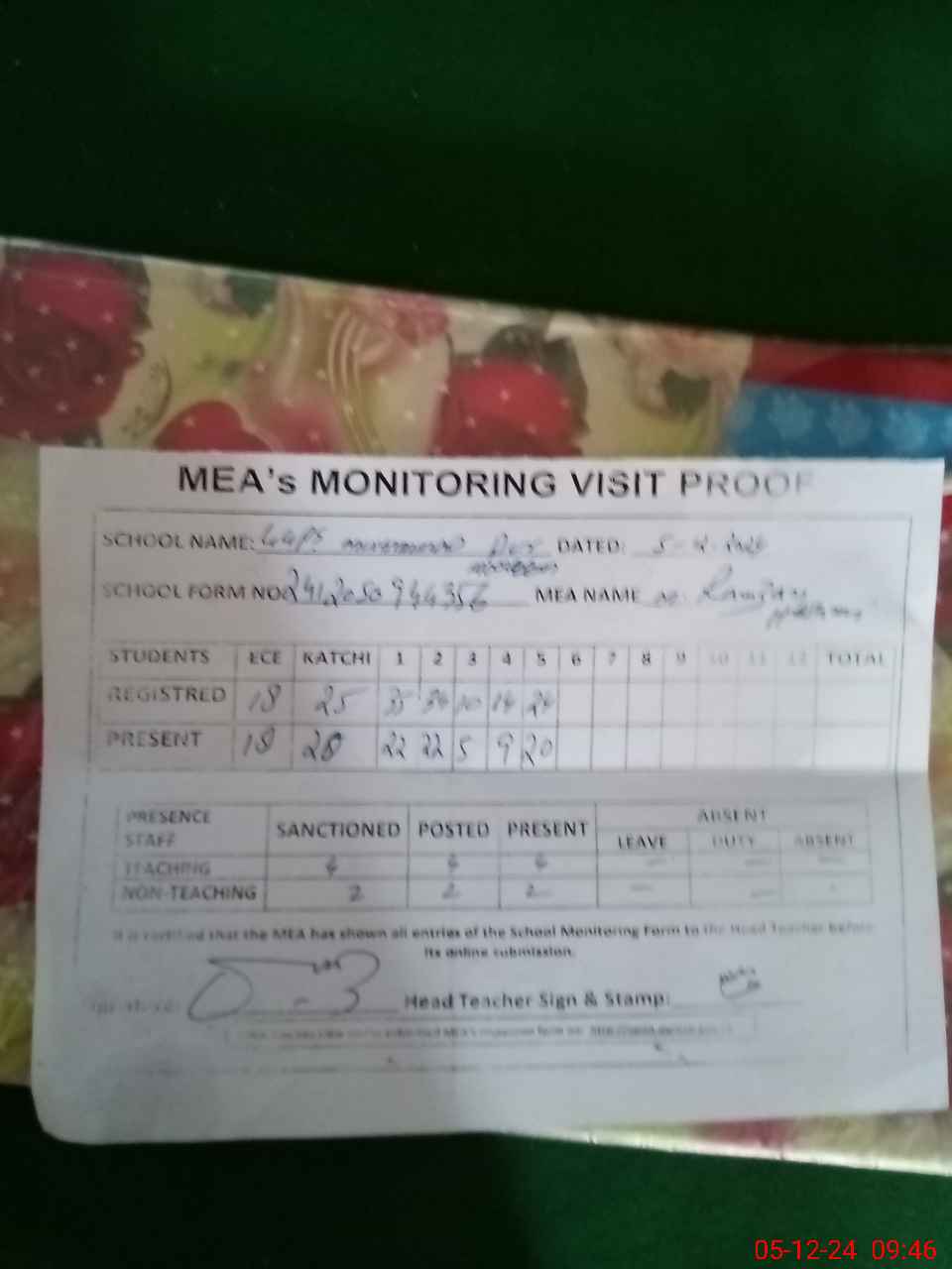 | Attendance Register | Head Teacher | MEA with School | Visit Proof |