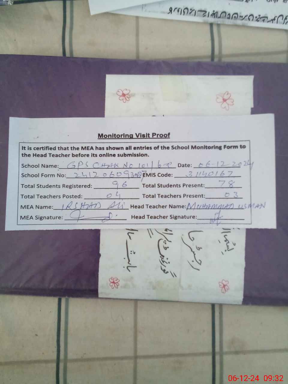 | EMIS Code: 31140167 | Name of School: GPS CHAK NO. 101/6-R | |||