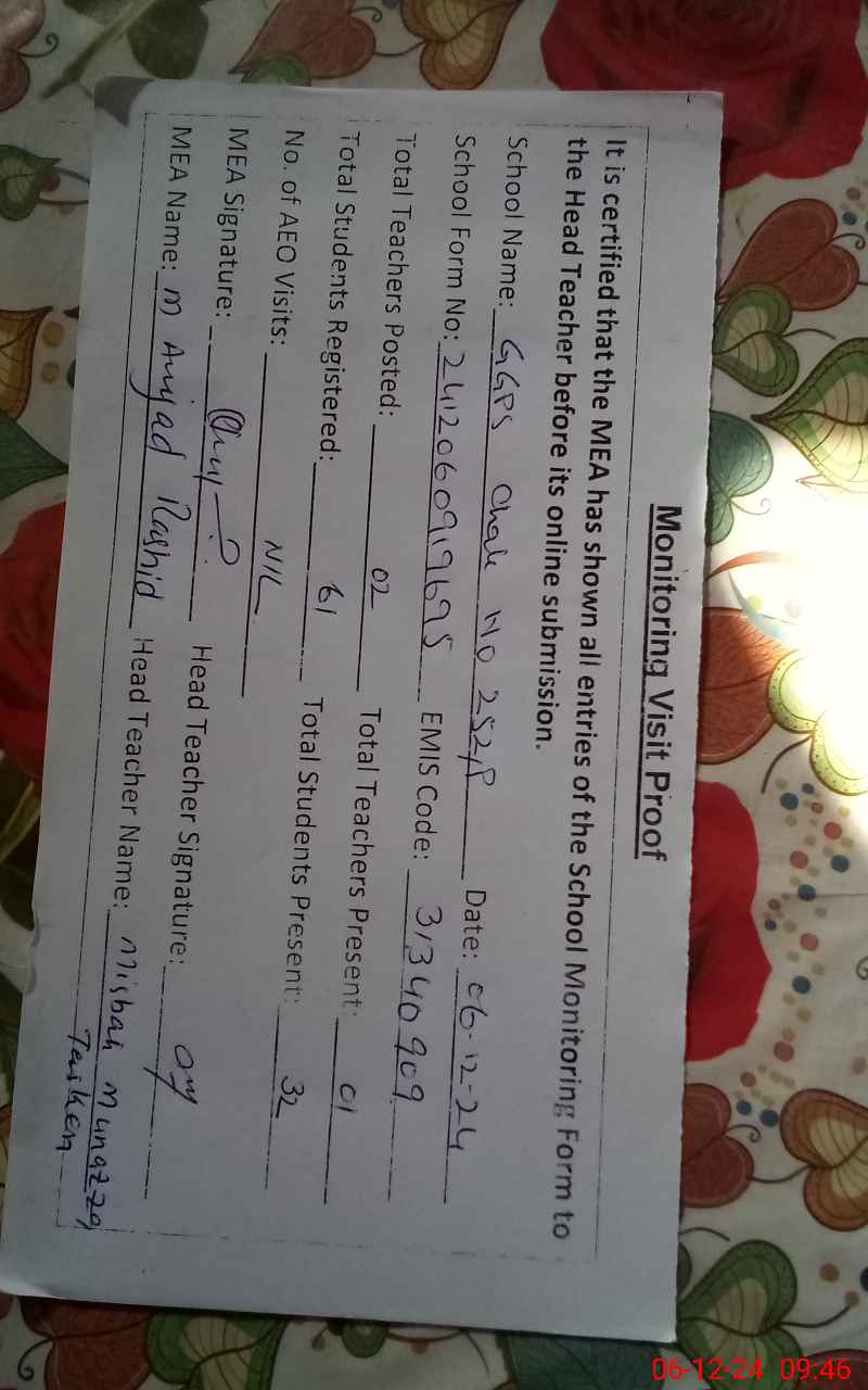 | Attendance Register | Head Teacher | MEA with School | Visit Proof |