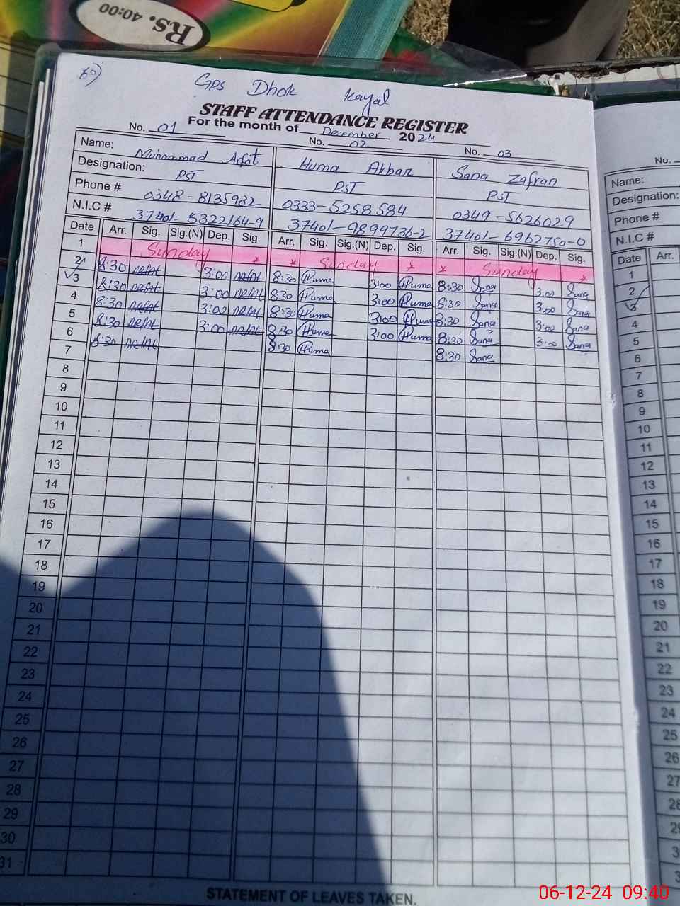 | CNIC | Full Name | Designation | R/C | Absence during last cal. month |
