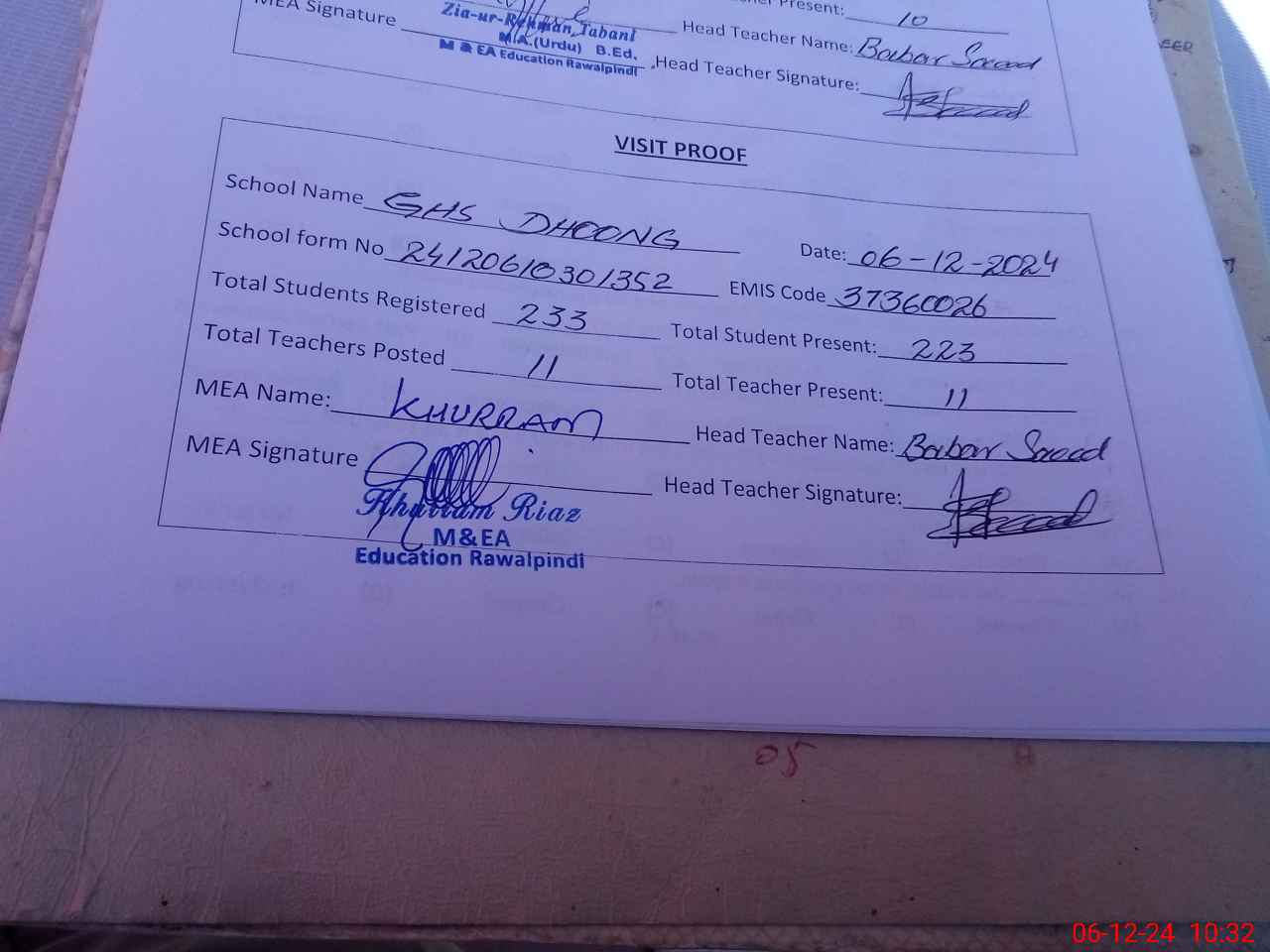 | Attendance Register | Head Teacher | MEA with School | Visit Proof |