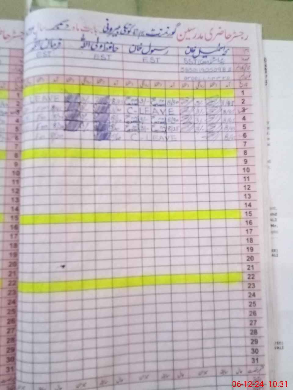 | CNIC | Full Name | Designation | R/C | Absence During Last Calender Month |
