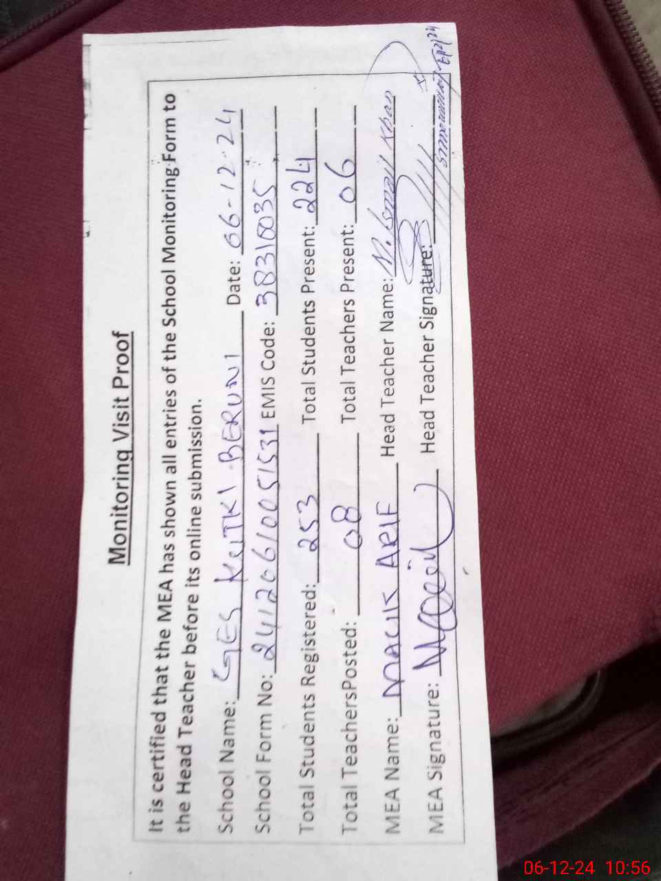 | Attendance Register | Head Teacher | MEA with School | Visit Proof |