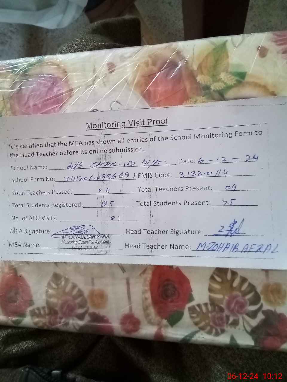 | Attendance Register | Head Teacher | MEA with School | Visit Proof |