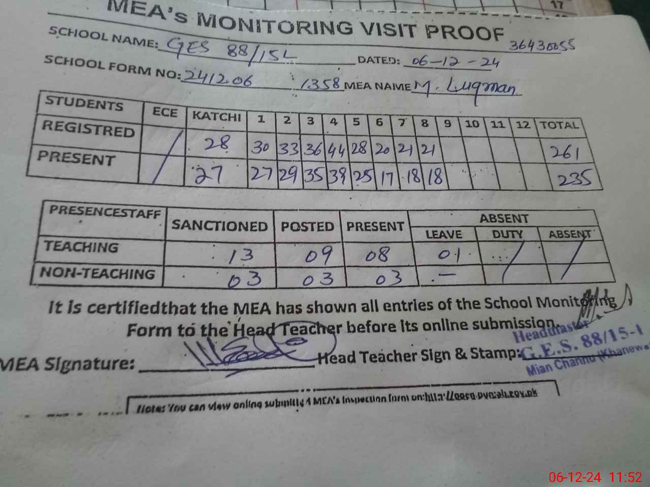 | Attendance Register | Head Teacher | MEA with School | Visit Proof |