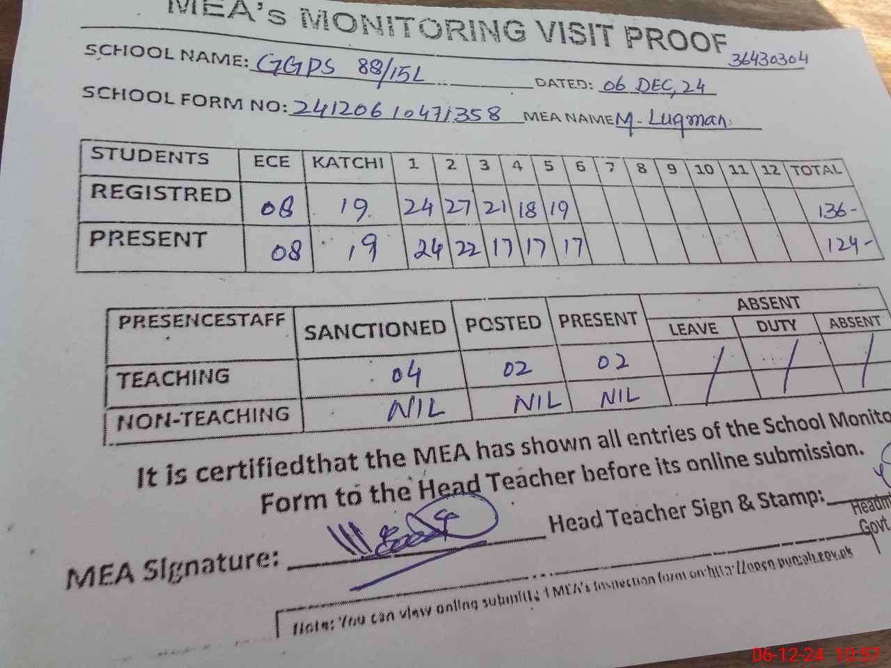| Attendance Register | Head Teacher | MEA with School | Visit Proof |