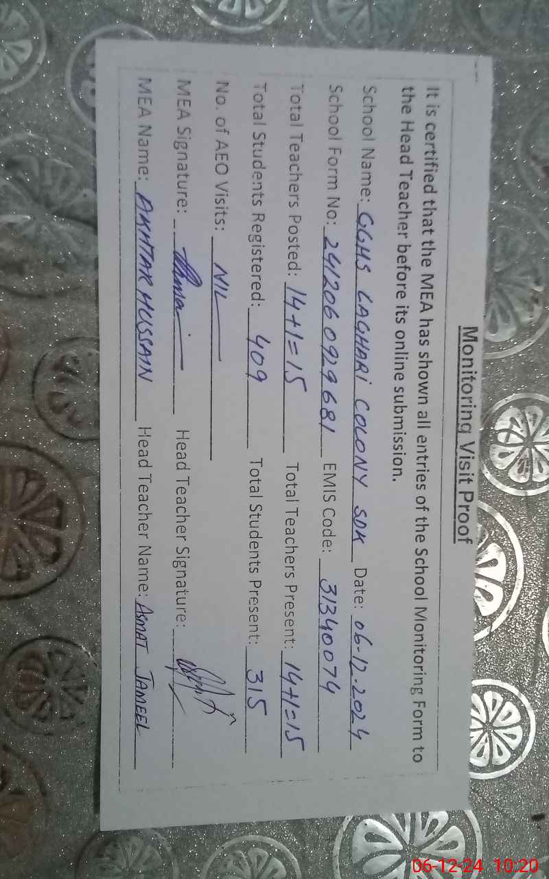 | EMIS Code: 31340074 | Name of School: GGHS LEGHARI COLONY | |||