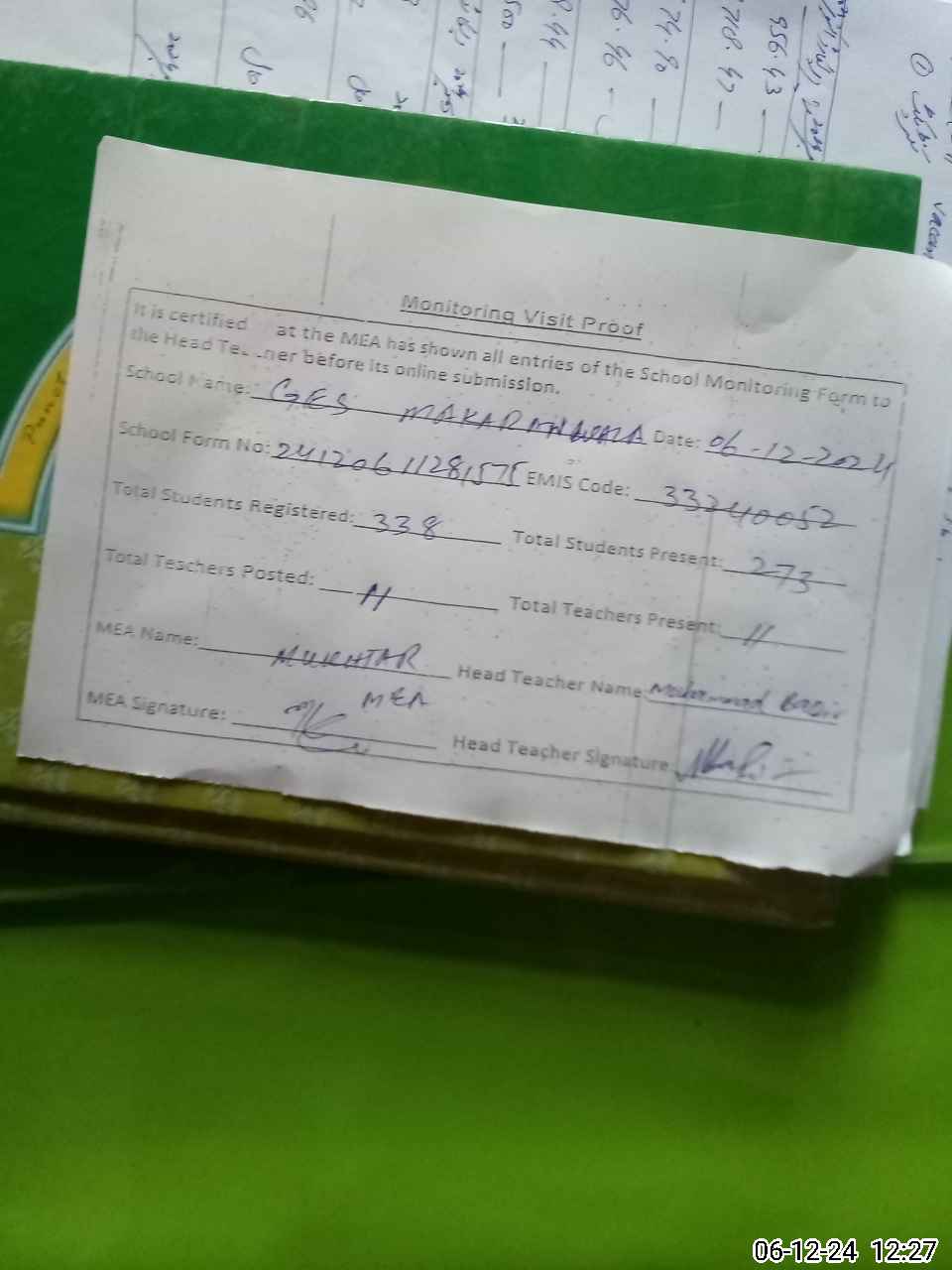 | Attendance Register | Head Teacher | MEA with School | Visit Proof |