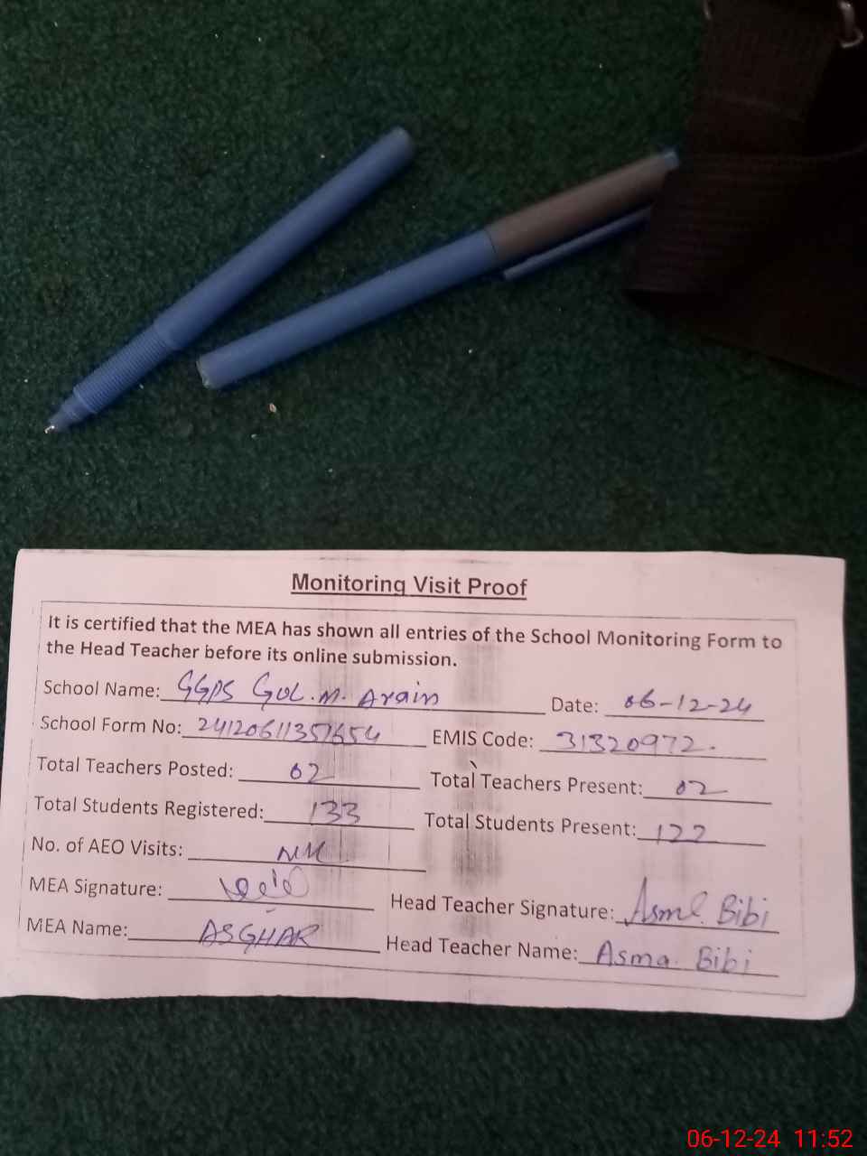 | Monitoring Date: 06-12-2024 | Start Time: 06-12-2024 11:35 AM | End Time: 06-12-2024 11:53 AM | Name of MEA: Kh**** Ah**** | |