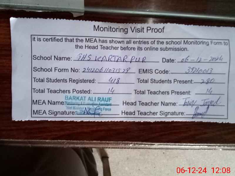 | EMIS Code: 39210013 | Name of School: GHS KARTAR PUR | |||
