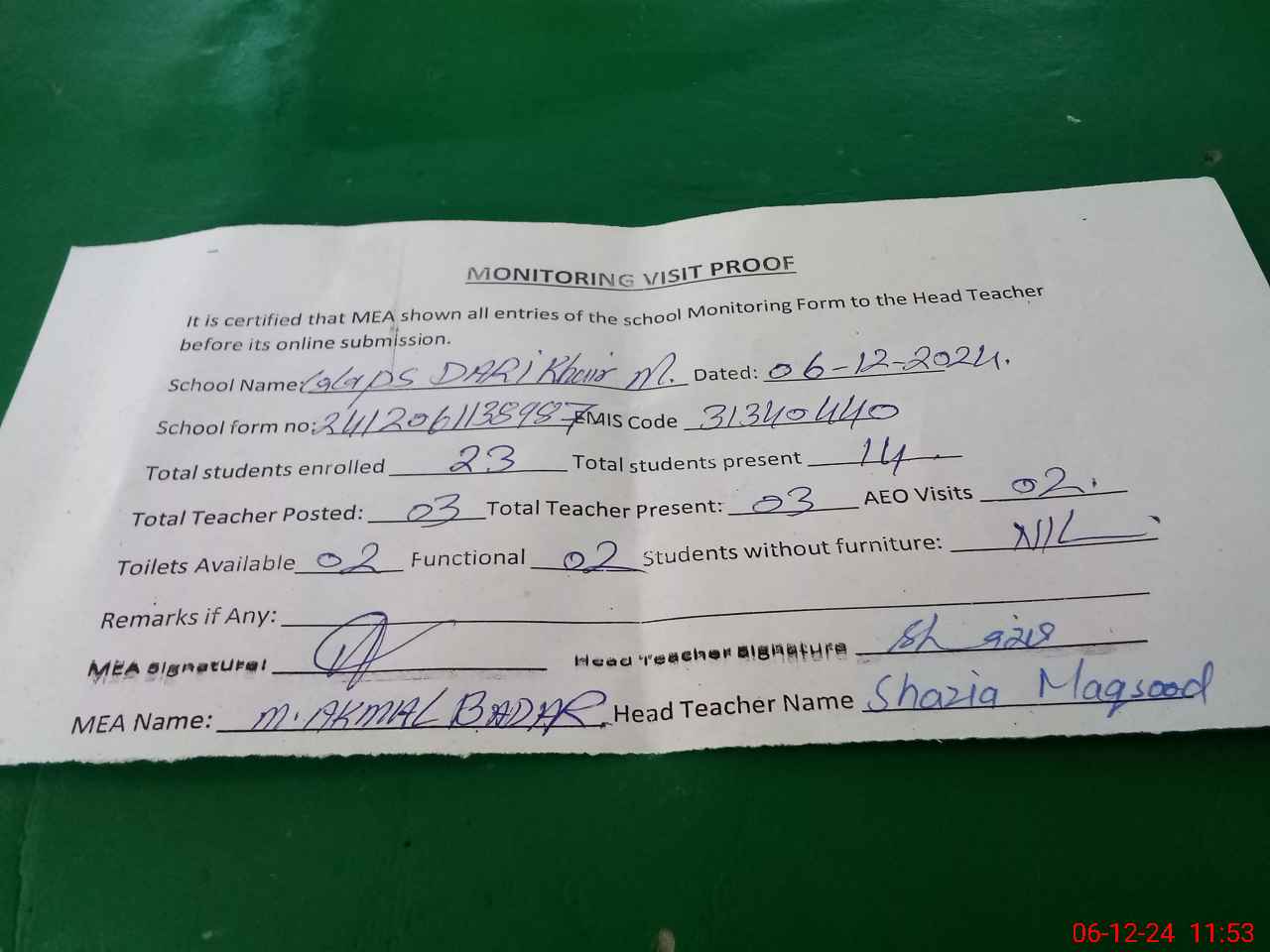 | EMIS Code: 31340440 | Name of School: GGPS DARI KHAIR MUHAMMAD | |||