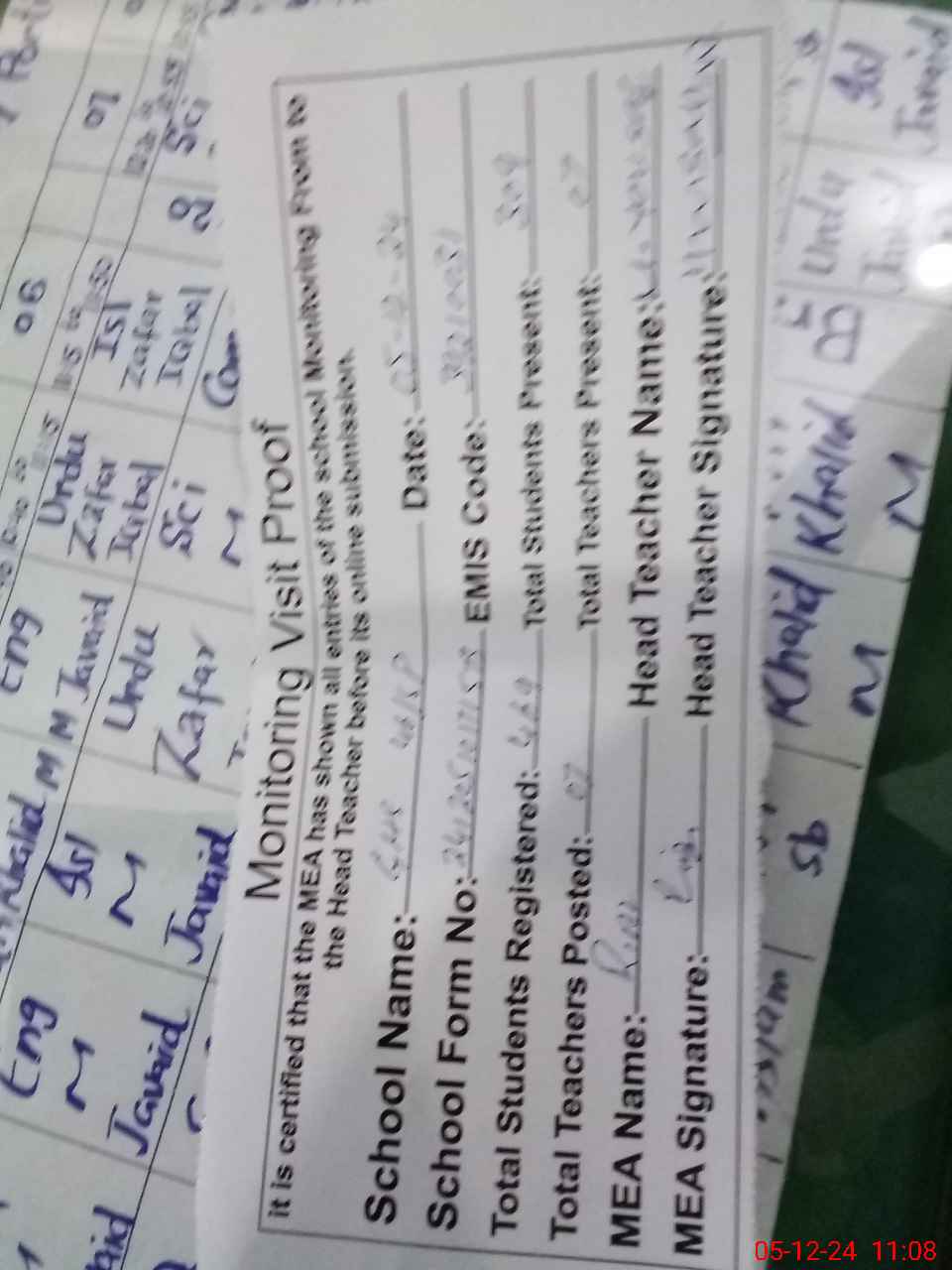 | Attendance Register | Head Teacher | MEA with School | Visit Proof |