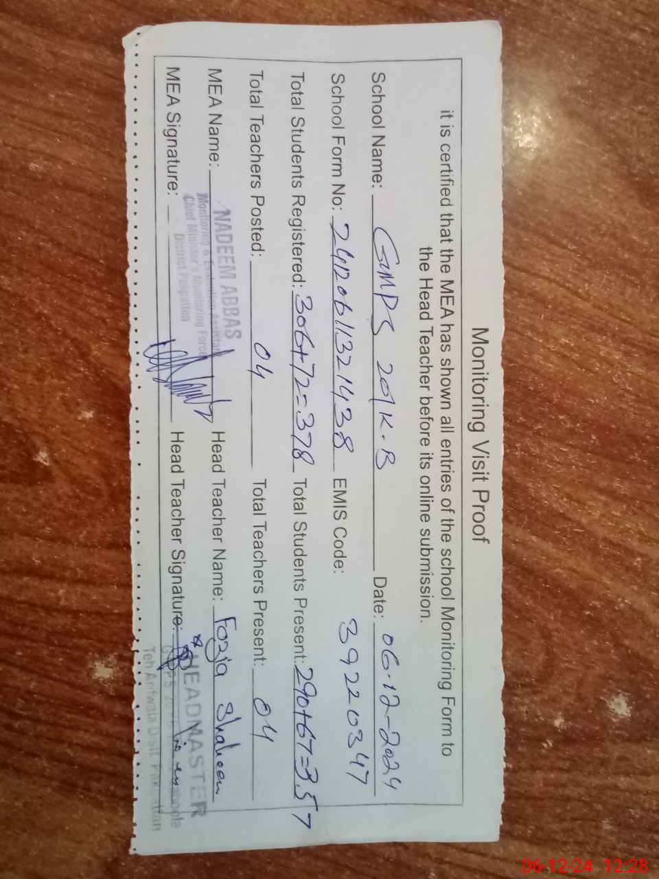 | Attendance Register | Head Teacher | MEA with School | Visit Proof |