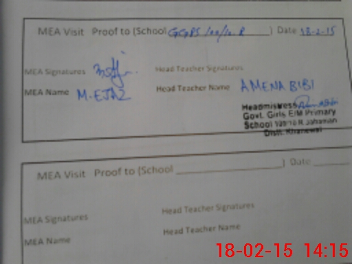 | Attendance Register | Head Teacher | MEA with School | Visit Proof |